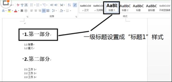 2.選中一級(jí)標(biāo)題,點(diǎn)擊樣式里的“第一部分”,依次將所有的一級(jí)標(biāo)題進(jìn)行設(shè)置,標(biāo)題1設(shè)置完成后,選擇“第二部分”依次完成二級(jí)標(biāo)題設(shè)置,以此類推。