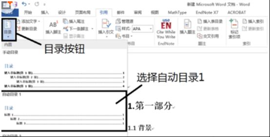 4、點(diǎn)擊工具欄的最左邊的“目錄”,選擇“自動(dòng)目錄1”。