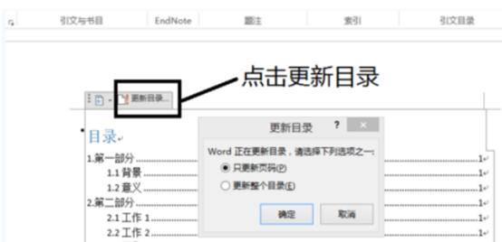 5、這樣就自動(dòng)生成目錄了,如果用戶更改標(biāo)題后,可以選中目錄,點(diǎn)擊“更新目錄”按鈕,在彈出的窗口中選擇“更新整個(gè)目錄”,這樣目錄就會(huì)自動(dòng)更新了。