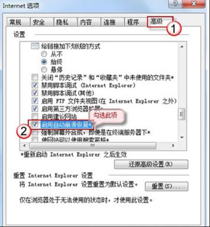 通過在工具欄的高級選項中,勾選自動崩潰恢復(fù)選項后,重啟瀏覽器就可以輕松恢復(fù)IE崩潰時被意外關(guān)閉的網(wǎng)頁了。