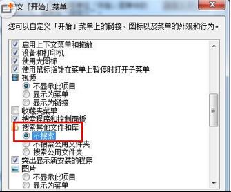 3、在彈出的“自定義‘開始’菜單”窗口中,拖動(dòng)滑動(dòng)條找到“搜索其他文件和庫”選項(xiàng),點(diǎn)選“不搜索”選項(xiàng)。
