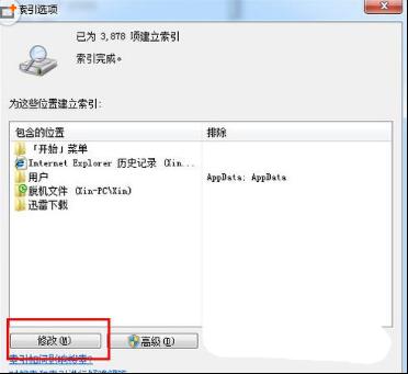 5、此時(shí)就可看到默認(rèn)Windows索引了“開始”菜單、IE歷史記錄、用戶文件夾和脫機(jī)文件,然后點(diǎn)擊“修改”按鈕可以進(jìn)行自定義設(shè)置。