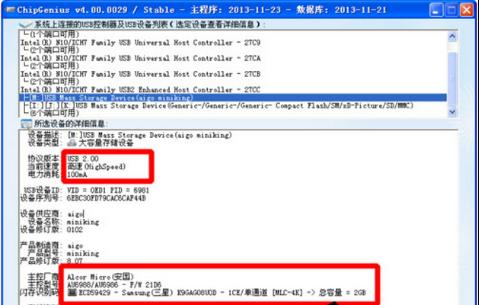 2、 chip genius會自動識別電腦所加載的usb控制器和設備,如圖片上半部分,下半部是具體的usb設備信息。