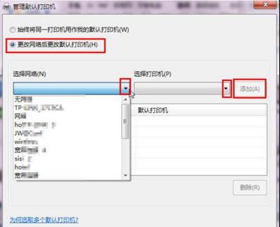 3、在“管理默認(rèn)打印機(jī)”的設(shè)置界面中,單擊“更改網(wǎng)絡(luò)后更改默認(rèn)打印機(jī)” ,在“選擇網(wǎng)絡(luò)”中點擊右邊的黑色三角小按鈕,從下拉列表中選擇一個網(wǎng)絡(luò),然后從“選擇打印機(jī)”列表中,單擊對應(yīng)的默認(rèn)打印機(jī),然后單擊“添加”。