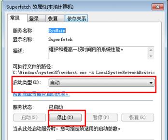 4、在打開的Superfetch服務窗口中,將“啟動類型”改成“已禁用”,最后點擊“停止”按鈕,再點擊“應用”——“確定”按鈕保存即可。
