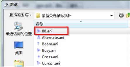 4、在“瀏覽”界面中,選擇喜歡的“紫藍(lán)熒光鼠標(biāo)指針”,再點(diǎn)擊“打開(kāi)”按鈕。