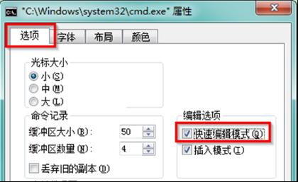 2、在打開“命令提示符 屬性”窗口中,切換到“選項(xiàng)”標(biāo)簽頁,點(diǎn)選窗口右側(cè)的“快速編輯模式”復(fù)選框,并點(diǎn)擊“確定”。