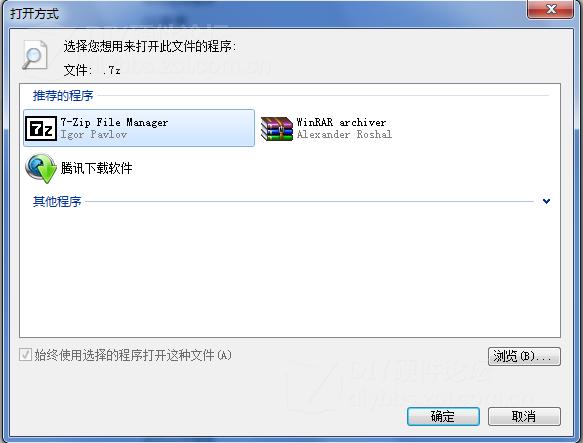 5、在打開方式里選擇打開的程序,比如7-Zip,如果沒有可通過下面的瀏覽來查找,然后確定即可