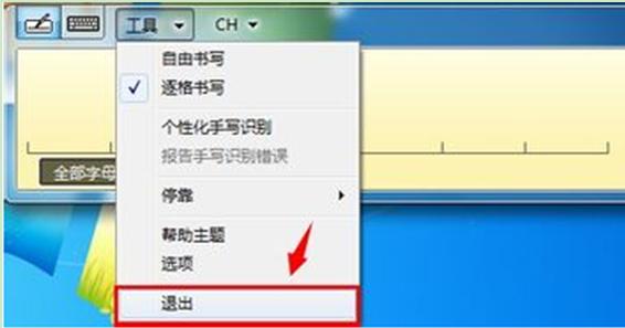3、當輸入完成后,想關(guān)閉手寫板時,也許你不知如何關(guān)閉掉,因為它不是通過關(guān)閉按鈕來關(guān)閉的,而是點擊“工具——退出”即可。