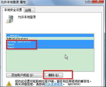 3、彈出“允許本地登錄屬性”窗口,只保留“Administrators”用戶,其余的用戶刪除掉。