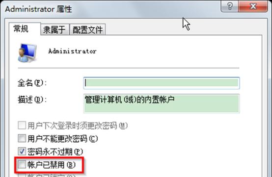 3、在打開的“Administrator 屬性”窗口中,在“常規(guī)”標簽頁中,將“賬戶已禁用”的勾選去掉。