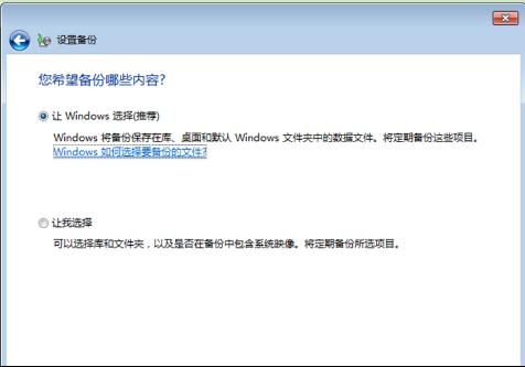 3、 設(shè)置Win7系統(tǒng)備份方式,在下圖界面中大家可看到有兩個(gè)選項(xiàng),分別是“讓W(xué)indows選擇”和“讓我選擇”,其實(shí)就是自動(dòng)和手動(dòng)的區(qū)別,區(qū)別如下: