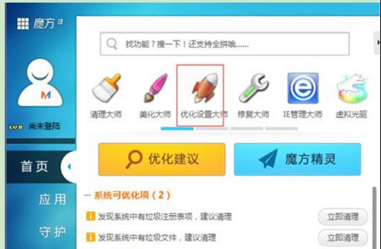 2、安裝完成后打開魔方優(yōu)化大師,點擊的“優(yōu)化設(shè)置大師”。