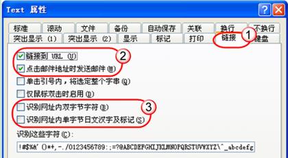 2、切換到“鏈接”標簽頁,勾選“鏈接到URL”,如果還希望在文本編輯器中點擊郵件地址就能發(fā)郵件,則選中“點擊郵件地址時發(fā)送郵件”選項,這里需要注意的是,有些網(wǎng)址中可能含有中文字符或單字節(jié)的日文符號或標記,如果讓這類網(wǎng)址也發(fā)揮作用,那么就需要同時選中“識別網(wǎng)址內雙字節(jié)字符”和“識別網(wǎng)址內單字節(jié)日文漢字及標記”選項,選擇好后點擊確定按鈕。