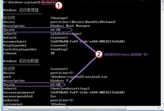 2、在打開的命令窗口光標(biāo)處鍵入bcdedit,按回車鍵。檢查Windows啟動(dòng)管理器和Windows啟動(dòng)加載器下locale對(duì)應(yīng)的語(yǔ)言是否與Windows7系統(tǒng)語(yǔ)言一致。