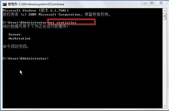 2、在命令提示符窗口光標(biāo)處輸入“net statistics”命令,按回車,就會顯示計(jì)算機(jī)中正在運(yùn)行的服務(wù)統(tǒng)計(jì)列表了。