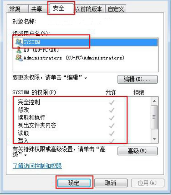 2、切換到“安全”標(biāo)簽頁,在“組或用戶名”欄中選擇登錄Windows的用戶名,再在“SYSTEM的權(quán)限”列表框中將各項全部設(shè)為“允許”,然后點擊“確定”保存設(shè)置即可。