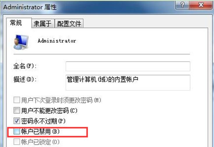 3、在打開的administrator屬性窗口中,在常規(guī)標(biāo)簽頁取消“帳戶已禁用”的勾選。