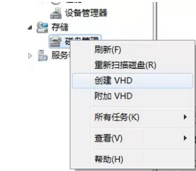 1、右鍵“計(jì)算機(jī)”選擇管理,在打開的計(jì)算機(jī)管理界面中,右鍵磁盤管理,選擇創(chuàng)建vhd,大小大概20G,使用固定大小。