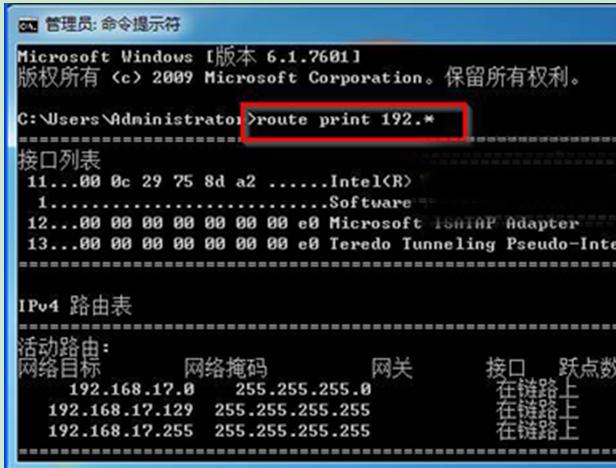 4、比如當(dāng)用戶還需查詢IP路由表里以“192”開頭的路由信息的話,也可以在其中輸入“route print 192.*”命令后按回車鍵,就可查詢到192開頭的IP路由信息了。