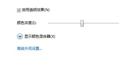 3、在Win7系統(tǒng)“窗口顏色”設(shè)置的界面中,在“顏色濃度”這個(gè)欄目的位置拉動滑動條設(shè)置顏色的透明程度。