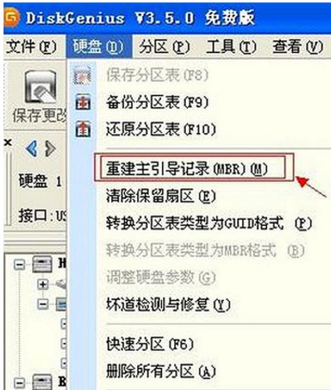 第二步、點(diǎn)擊上方的“硬盤——重建主引導(dǎo)記錄”。
