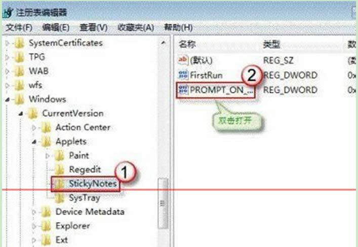 3、在打開的注冊表中,依次展開以下的注冊表項(xiàng):HKEY_CURRENT_USER\Software\Microsoft\Windows\CurrentVersion\Applets\StickyNotes。