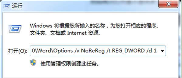 按“Win+R”打開“運行”窗口,輸入"reg add HKCUSoftwareMicrosoftOffice12.0WordOptions /v NoReReg /t REG_DWORD /d 1"命令后按回車鍵即可。