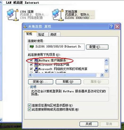3、在常規(guī)選項(xiàng)里找到“Netware客戶端服務(wù)”的選項(xiàng),然后選擇“卸載”,計(jì)算機(jī)提示重啟后生效選擇“否”。
