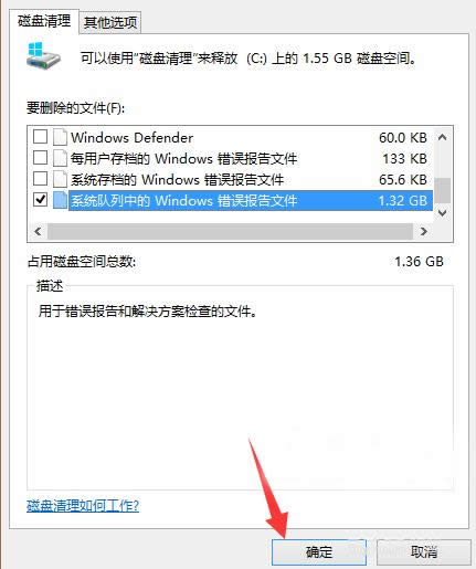 6、在“要刪除的文件選項”可看到系統(tǒng)隊列中的windows錯誤報告文件,選中然后點擊下方“確定”,便可將其刪除
