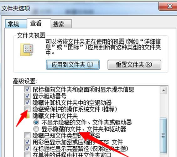 3、在設(shè)置中去掉“隱藏受保護(hù)的操作系統(tǒng)文件”的勾選,然后勾選“顯示隱藏的文件,文件夾和驅(qū)動(dòng)器”的選項(xiàng),點(diǎn)擊“確定”保存。
