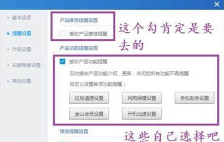 1、毒霸右下角彈窗廣告,由于大部分的右下角彈窗廣告都是相關(guān)產(chǎn)品的推薦,比如垃圾清理、隱私清理、手機(jī)助手等,打開金山毒霸,去掉“接收產(chǎn)品成本推薦提醒”前面的勾選。
