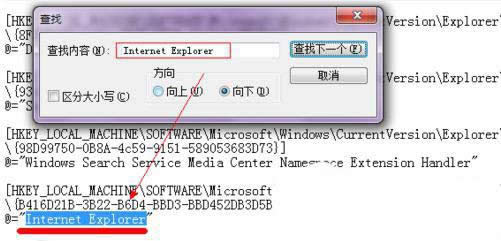 4、用記事本打開剛才的注冊(cè)表,用查找功能查找Internet Explorer,可看到控件號(hào)是{B416D21B-3B22-B6D4-BBD3-BBD452DB3D5B}(可能機(jī)器不同號(hào)不同,所以要麻煩一下)
