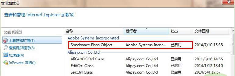 3、在“管理加載項”里啟用“Shockwave Flash Object”。