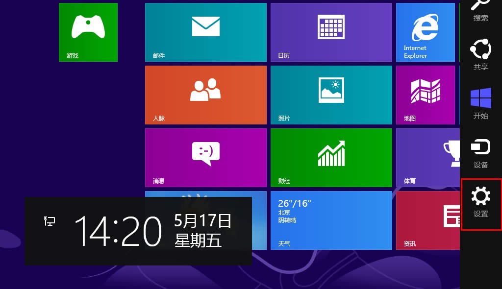 | Windows 7,中文名稱視窗7,是由微軟公司(Microsoft)開發(fā)的操作系統(tǒng),內(nèi)核版本號為Windows NT 6.1。Windows 7可供家庭及商業(yè)工作環(huán)境:筆記本電腦 、平板電腦 、多媒體中心等使用。Windows 7可供選擇的版本有:入門版(Starter)、家庭普通版(Home Basic)、家庭高級版(Home Premium)、專業(yè)版(Professional)、企業(yè)版(Enterprise)(非零售)、旗艦版(Ultimate)。 Windows8系統(tǒng)的UI比起windows7操作系統(tǒng)的UI更加的炫麗。但是部分用戶仍然覺得個(gè)性化設(shè)置不符合自己的要求或不滿意。那么如何對系統(tǒng)界面進(jìn)行自定義設(shè)置呢?下面大地教你Windows8個(gè)性化設(shè)置的方法。 1.按鍵盤上的“Win+C”打開“Charms ”點(diǎn)擊“設(shè)置”