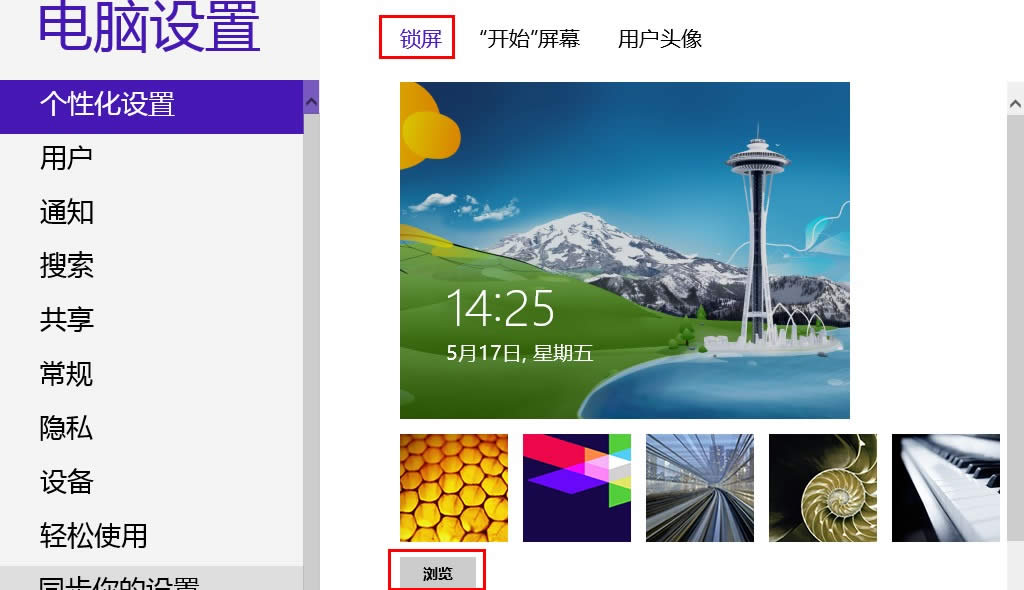 3.打開后選擇“個(gè)性化設(shè)置”,即可看到“鎖屏”,“開始屏幕”,“用戶頭像”三個(gè)選項(xiàng),在這里即可進(jìn)行個(gè)性化設(shè)置。點(diǎn)擊“鎖屏”,在下方選擇背景圖片,也可以選擇瀏覽自定義圖片。