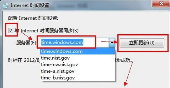 勾選“與Internet 時間服務(wù)器同步”選項,然后就能選擇你要同步的服務(wù)器,這樣就能獲取到最為準(zhǔn)確的時間了!