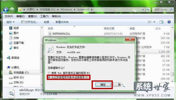 第三步、在對話框中將選項改到“從已安裝程序列表中選擇程序”,然后點擊“確定”。