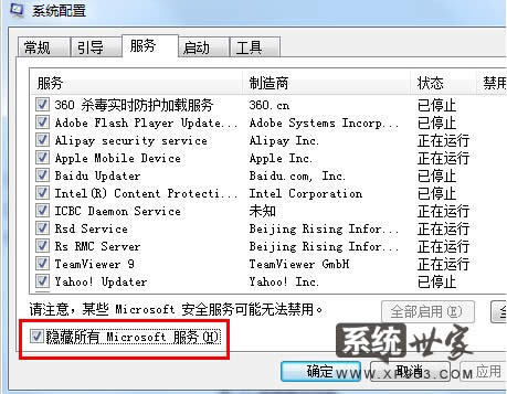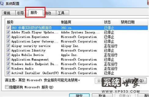 切換到服務(wù)選項(xiàng),然后將下方的隱藏所有microsoft選項(xiàng)勾選上,F(xiàn)在上面的窗口中出現(xiàn)的服務(wù)就是真實(shí)的電腦中第三方加載項(xiàng)的全部服務(wù)項(xiàng)目了,大家可以看看,哪些是不需要的,就將它刪除好了。