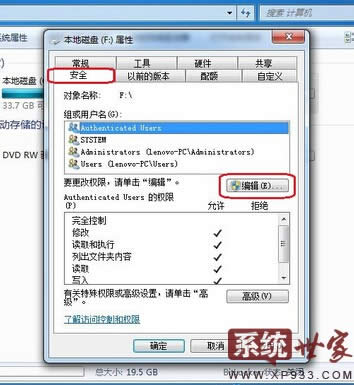 接下來,我們將屬性窗口切換到安全欄目下,然后點擊編輯選項。接下來點擊添加。