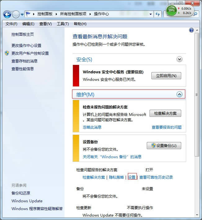 第二,點(diǎn)擊“操作中心”左上角的“更改操作中心設(shè)置”,點(diǎn)擊“維護(hù)”。