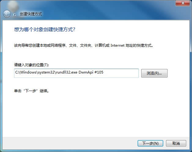 2、在“請(qǐng)鍵入項(xiàng)目的位置”中輸入“C:\Windows\system32\rundll32.exe DwmApi #105”,然后點(diǎn)下一步。