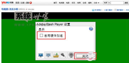 2、在彈出來的設(shè)置框中將“啟用硬件加速”前面的勾取消掉,然后點擊“關(guān)閉”按鈕;