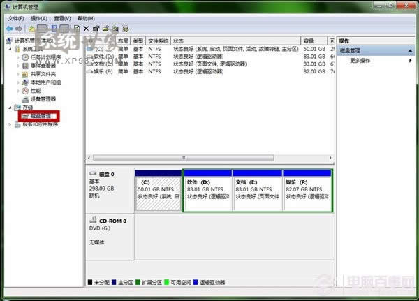 1、鼠標(biāo)右鍵點(diǎn)擊“計(jì)算機(jī)”選擇“管理”,調(diào)出“計(jì)算機(jī)管理”窗口,選中“磁盤管理”。