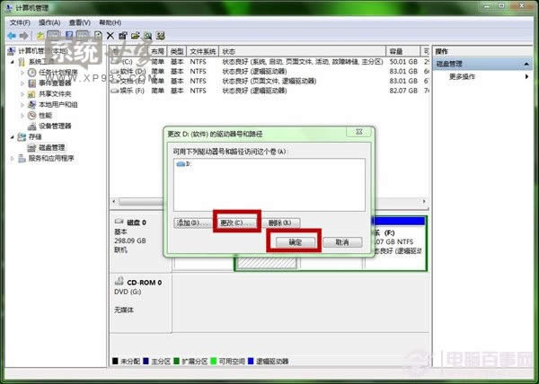 3、在彈出的窗口中,我們點(diǎn)擊“更改”,把該盤改成其他盤,點(diǎn)擊確定后。再改回來,這樣圖標(biāo)就可以恢復(fù)原樣了。