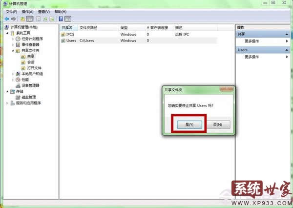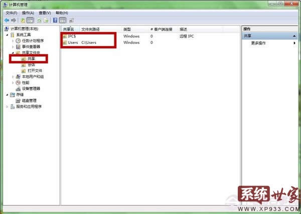 第二步、 在“計算機管理”窗口的左側(cè),依次找到“計算機管理”-“系統(tǒng)工具”-“共享文件夾”-“共享”,單擊“共享”文件夾,在窗口中間就可以看到共享文件夾。