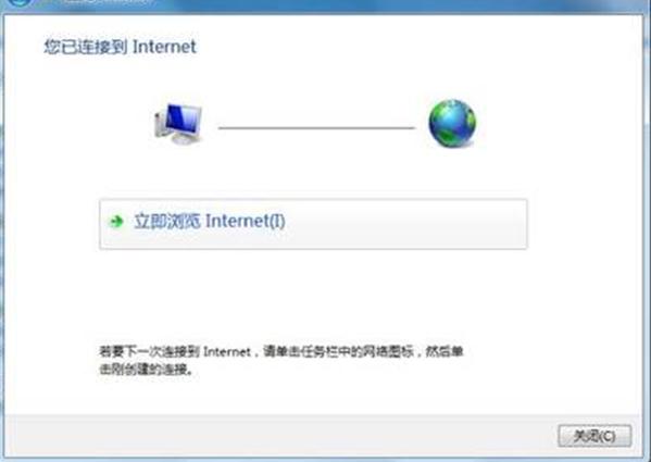 4、等待片刻即可看到“立即瀏覽 Internet”,這時WIN7寬帶連接已經(jīng)創(chuàng)建成功了。