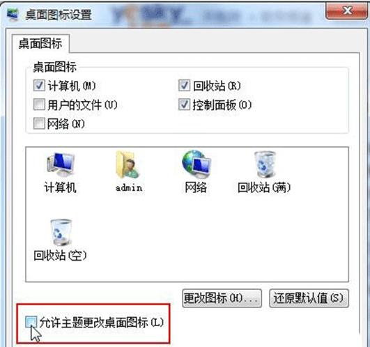 2. 彈出“桌面圖標(biāo)設(shè)置”對話框,氫“允許主題改變桌面圖標(biāo)”前面的勾去掉,然后單擊“確定”。