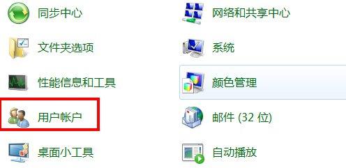 1、首先進入控制面板,在控制面板功能項中選項用戶賬戶;