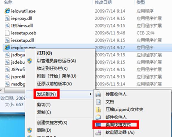 右擊iexplore.exe,選擇“發(fā)送到”----“桌面快捷方式”